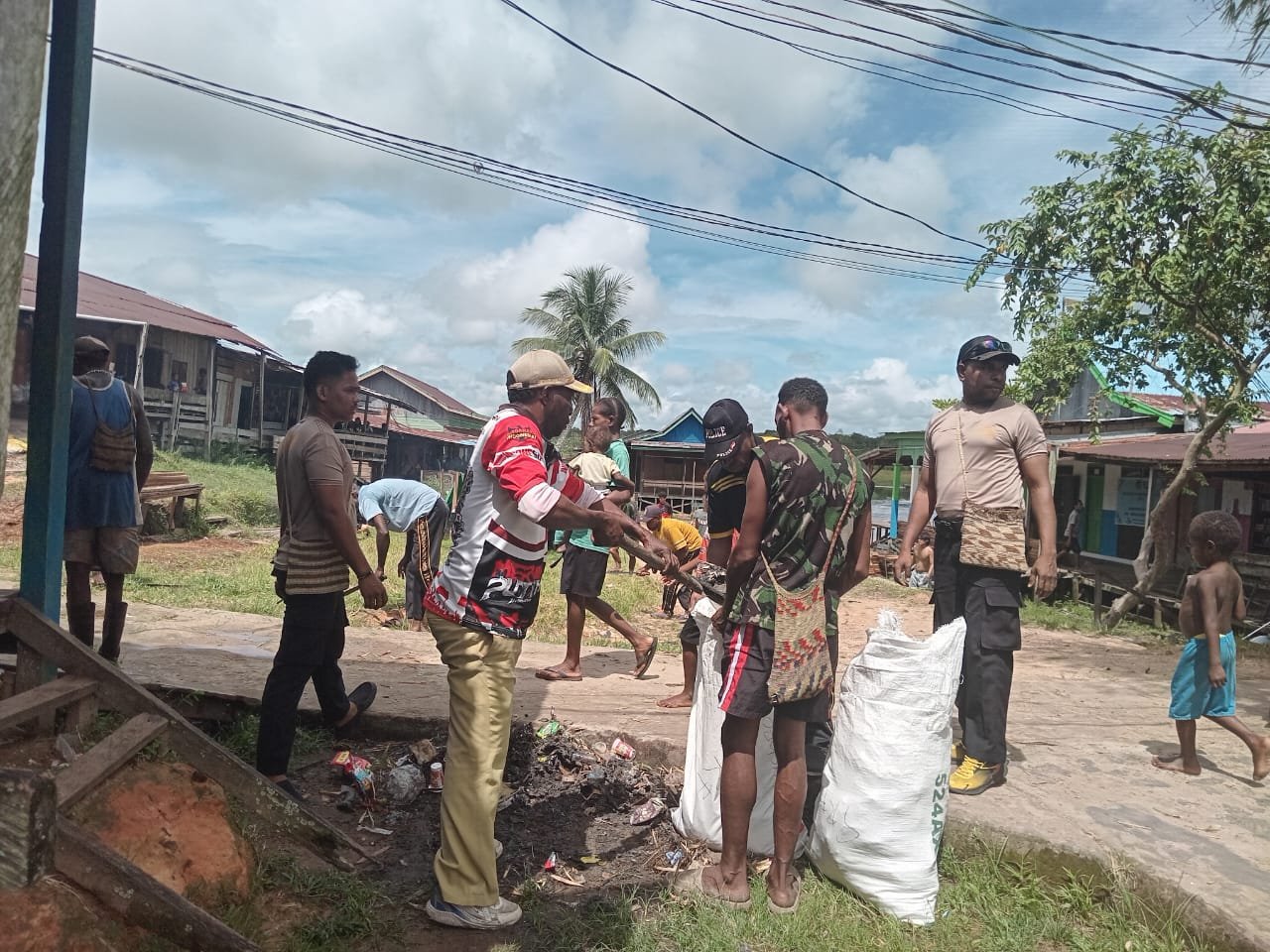 Papua – Dalam upaya kesiapsiagaan dan mitigasi bencana alam, khususnya banjir akibat tingginya intensitas curah hujan, Polsek Haju bersama Satgas Yonif 123/Rajawali dan elemen masyarakat melaksanakan kegiatan kerja bakti massal. Fokus kegiatan kali ini adalah membersihkan area vital di kompleks pelabuhan dan pasar Distrik Haju.