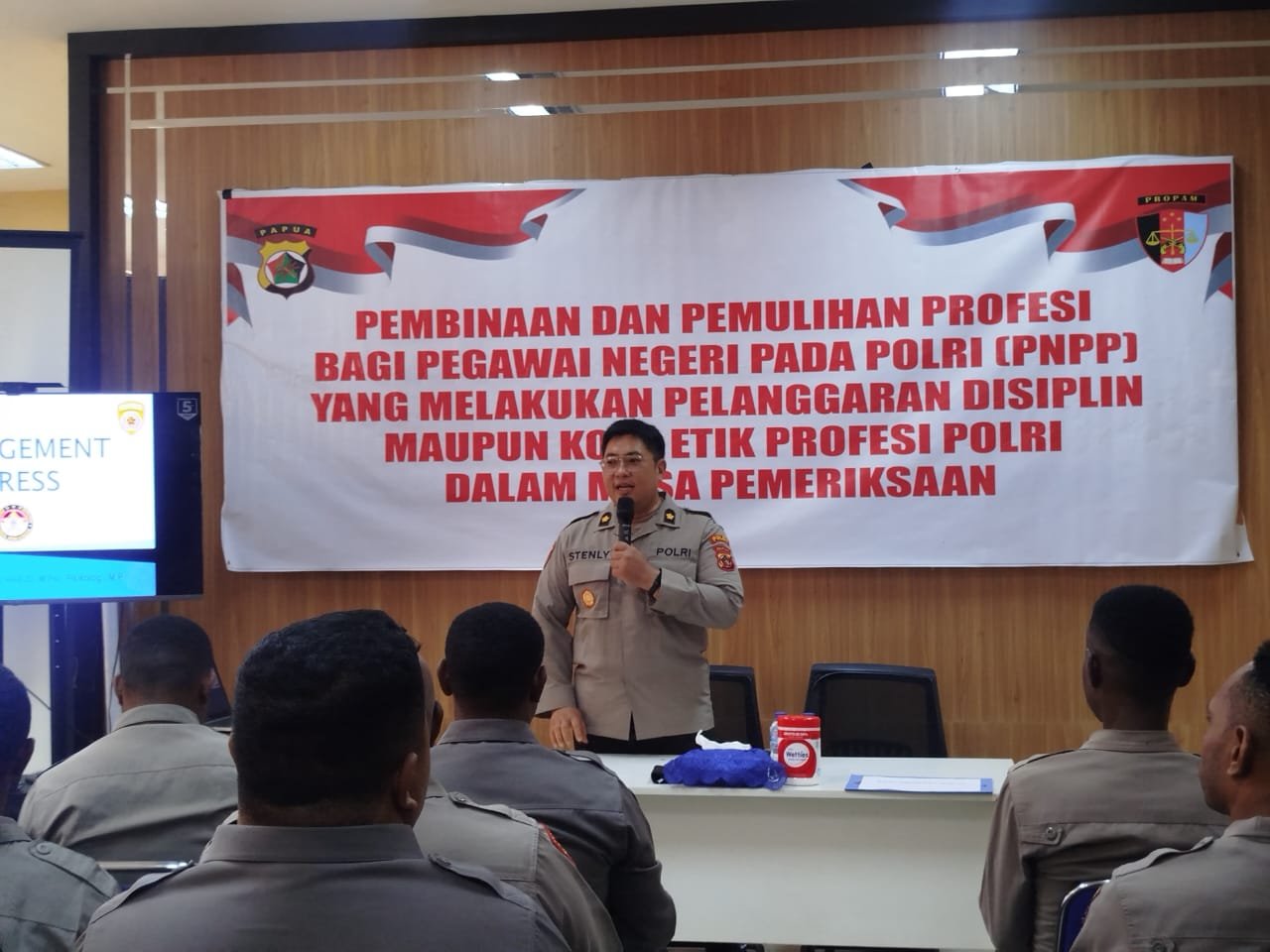 Papua – Polda Papua melalui Bidang Profesi dan Pengamanan (Propam) melanjutkan pelaksanaan Pembinaan dan Pemulihan Profesi Polri bagi Pegawai Negeri Pada Polri (PNPP) yang melakukan pelanggaran disiplin maupun Kode Etik Profesi Polri. Kegiatan ini memasuki hari kedua dan berlangsung di Ruang Rapat Propam Polda Papua, Koya Koso, Selasa (12/08/25).