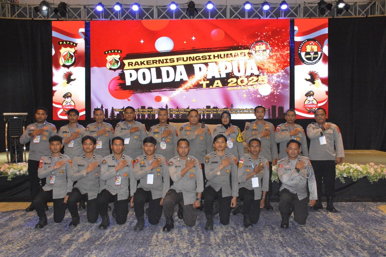 Papua – Polda Papua resmi menutup kegiatan Rapat Kerja Teknis (Rakernis) Fungsi Humas Tahun Anggaran 2025 yang berlangsung pada Rabu (24/09). Penutupan kegiatan Rakernis oleh Kabid Humas ditandai dengan pemukulan tifa.