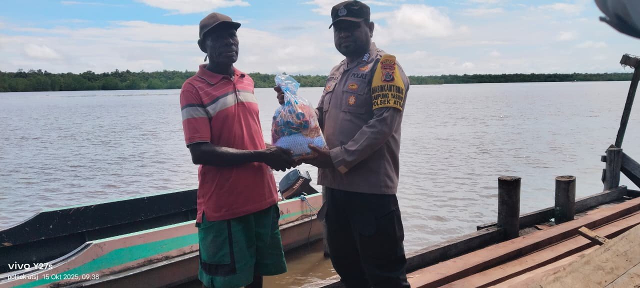 Papua – Kapolres Asmat Akbp Wahyu Basuki, S.I.K melalui Kapolsek Atsj Ipda I Nyoman Tunas, berikan bantuan Limabelas (15) jaring kepada nelayan di 4 Kampung yang berada di Ibu Kota Distrik Atsj, Rabu (15/10/2025).