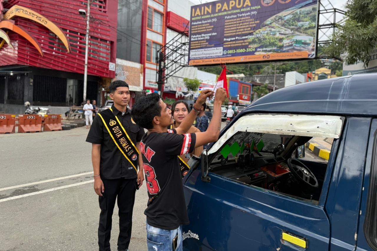 Kibarkan Semangat Kemerdekaan, Duta Humas Polda Papua Bagikan Bendera ke Pengendara