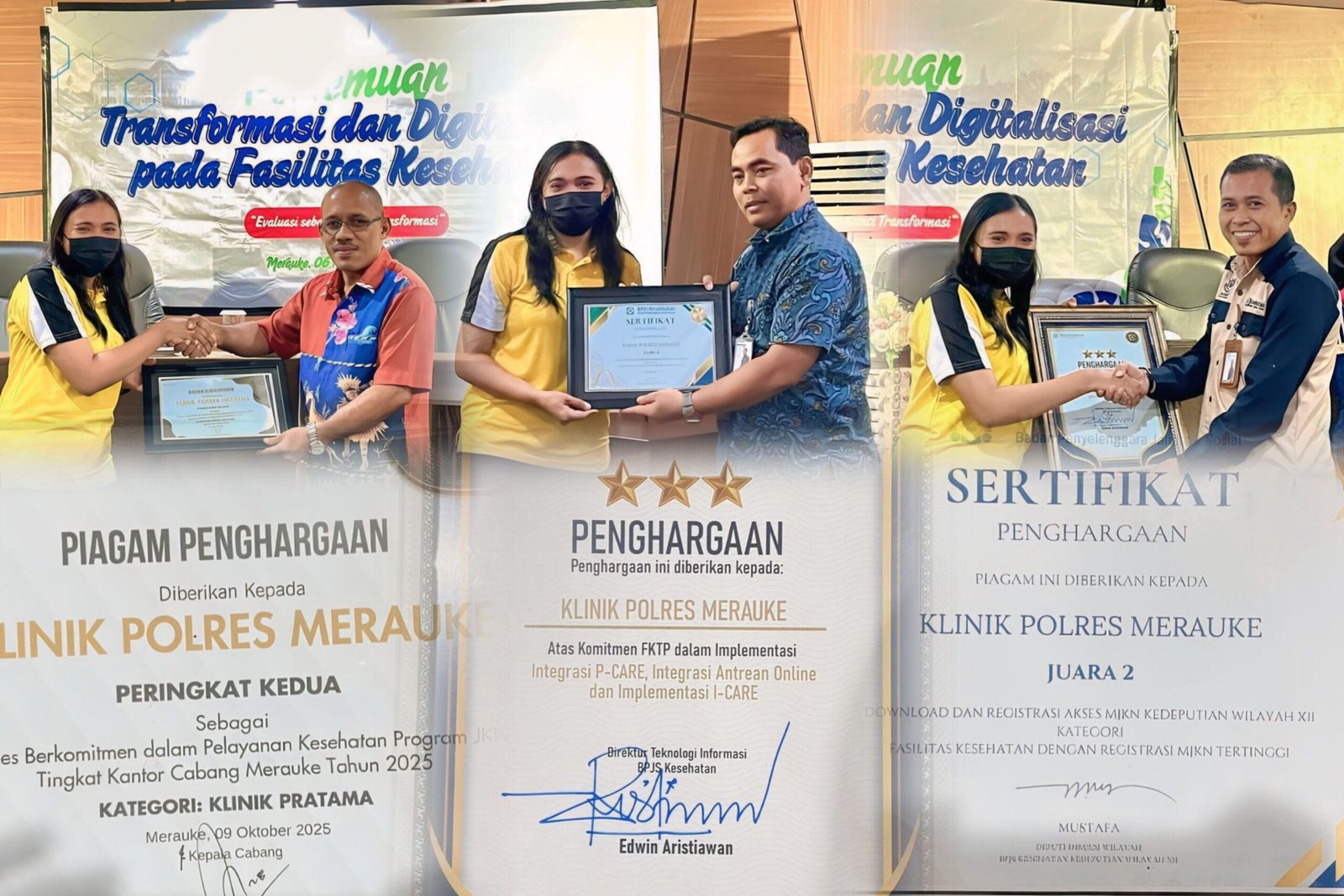 Tidak hanya itu, Klinik Pratama Polres Merauke turut menerima penghargaan atas komitmen dalam implementasi integrasi P-Care, integrasi antrean online, serta implementasi I-Care yang menunjukkan kesiapan fasilitas kesehatan dalam mendukung transformasi layanan kesehatan berbasis digital sesuai kebijakan BPJS Kesehatan.