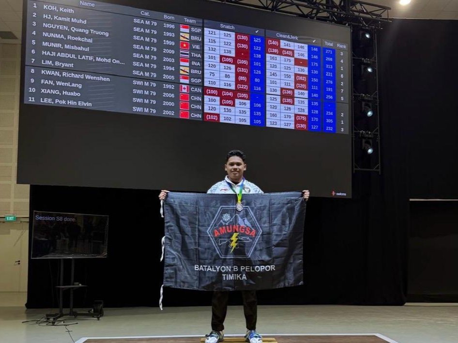 Papua – Personel Brimob Batalyon B Mimika Polda Papua, Bripda Bismahul Munir kembali menorehkan prestasi gemilang di kancah internasional. Atlet angkat besi muda berbakat ini berhasil meraih medali perak di SEA CHAMPIONSHIP 2025 Singapura di kelas 79 kg dengan total angkatan 267 kg.