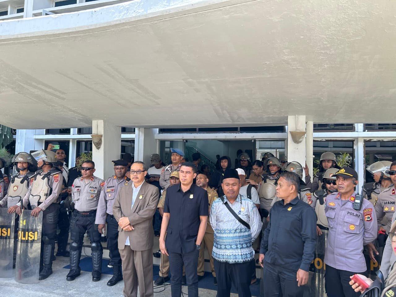 Papua – Kepolisian Daerah Papua melalui personel Polresta Jayapura Kota bersama jajaran melaksanakan pengamanan aksi orasi mahasiswa dari aliansi Cipayung Plus yang terdiri dari HMI MPO, PMII, KAMMI, dan IMM di Kantor DPR Provinsi Papua, Senin (08/09).