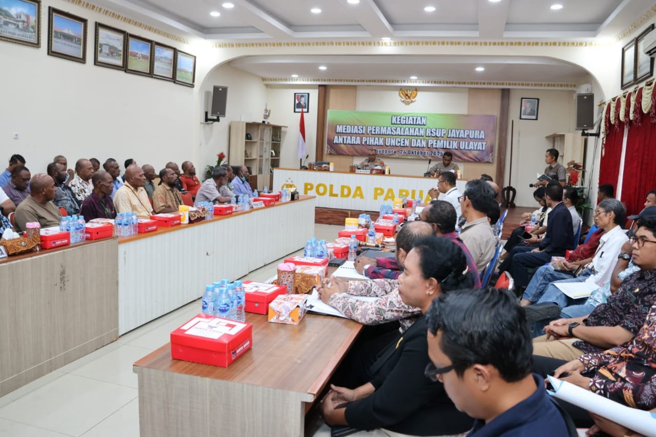 Papua – Kepolisian Daerah Papua memfasilitasi kegiatan mediasi terkait permasalahan lahan pembangunan Rumah Sakit Umum Pusat (RSUP) Jayapura yang melibatkan pihak Universitas Cenderawasih (Uncen) dan perwakilan masyarakat adat. Kegiatan berlangsung di Aula Rupatama Mapolda Papua, Jalan Dr. Sam Ratulangi No. 8, Distrik Jayapura Utara, Kota Jayapura, pada Jumat (24/10/2025).
