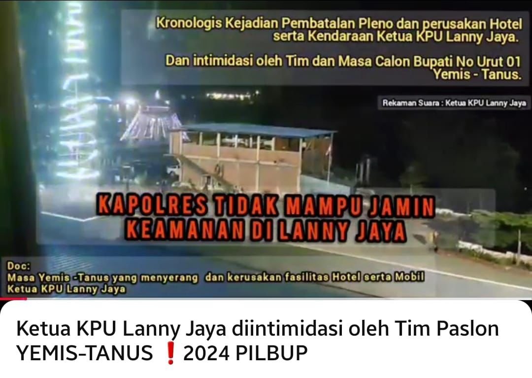 Papua – Beredar rekaman Video Audio Ketua KPU Lanny Jaya yang diunggah di akun media sosial Facebook Kaonak Nen Jr yang berdurasi 2.45 menit yang menyebut Aparat keamanan tidak mampu menjamin keamanan di Lanny Jaya.