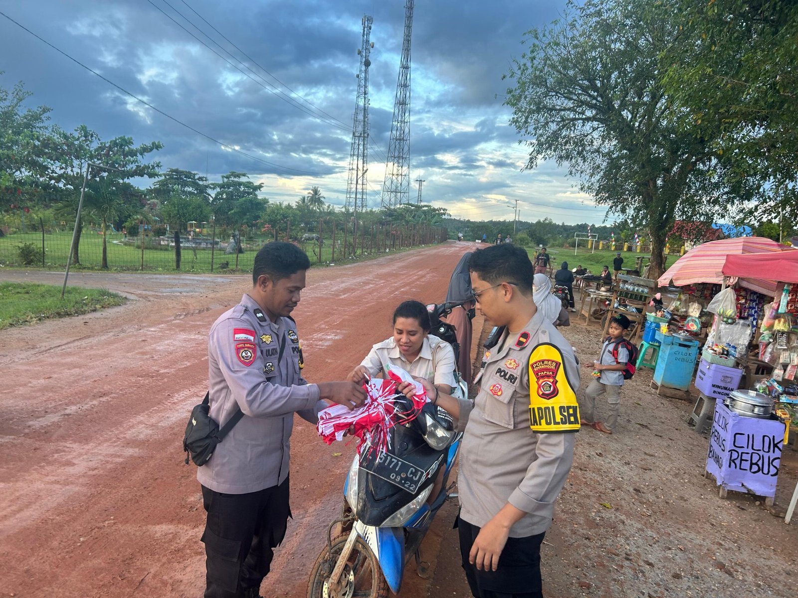 Kegiatan yang dipimpin langsung oleh Kapolsek Jair, IPDA Akbar, S.Tr.K., ini melibatkan seluruh personel Polsek Jair Polres Boven Digoel. Dengan penuh semangat, para personel membagikan 100 lembar Bendera Merah Putih secara gratis kepada pengguna jalan, khususnya pengendara sepeda motor dan mobil yang melintas di Jalan Asiki.