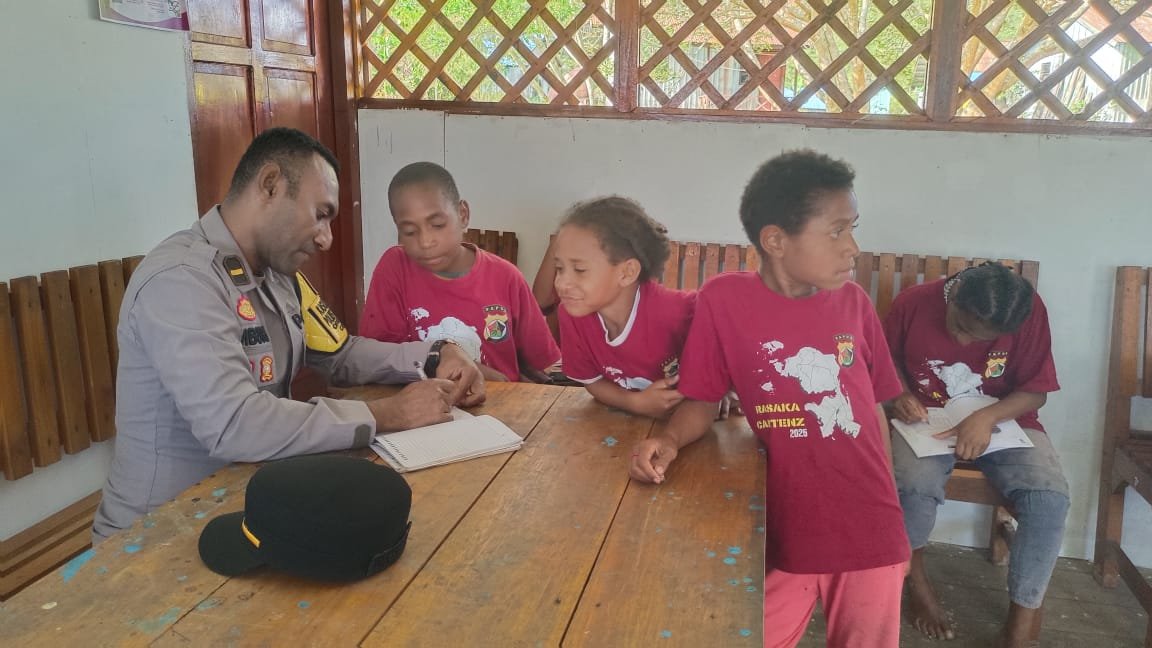 Papua – Program Si-IPAR (Polisi Pi Ajar), bagian dari Operasi Rasaka Cartenz 2025, Hadir Mengajar Membaca dan Menulis Kepada Anak-anak Generasi Emas Papua, kegiatan dilaksanakan di Balai Kampung Distrik Oksibil, Kabupaten Pegunungan Bintang, Oksibil. Selasa (12/08) Sore.