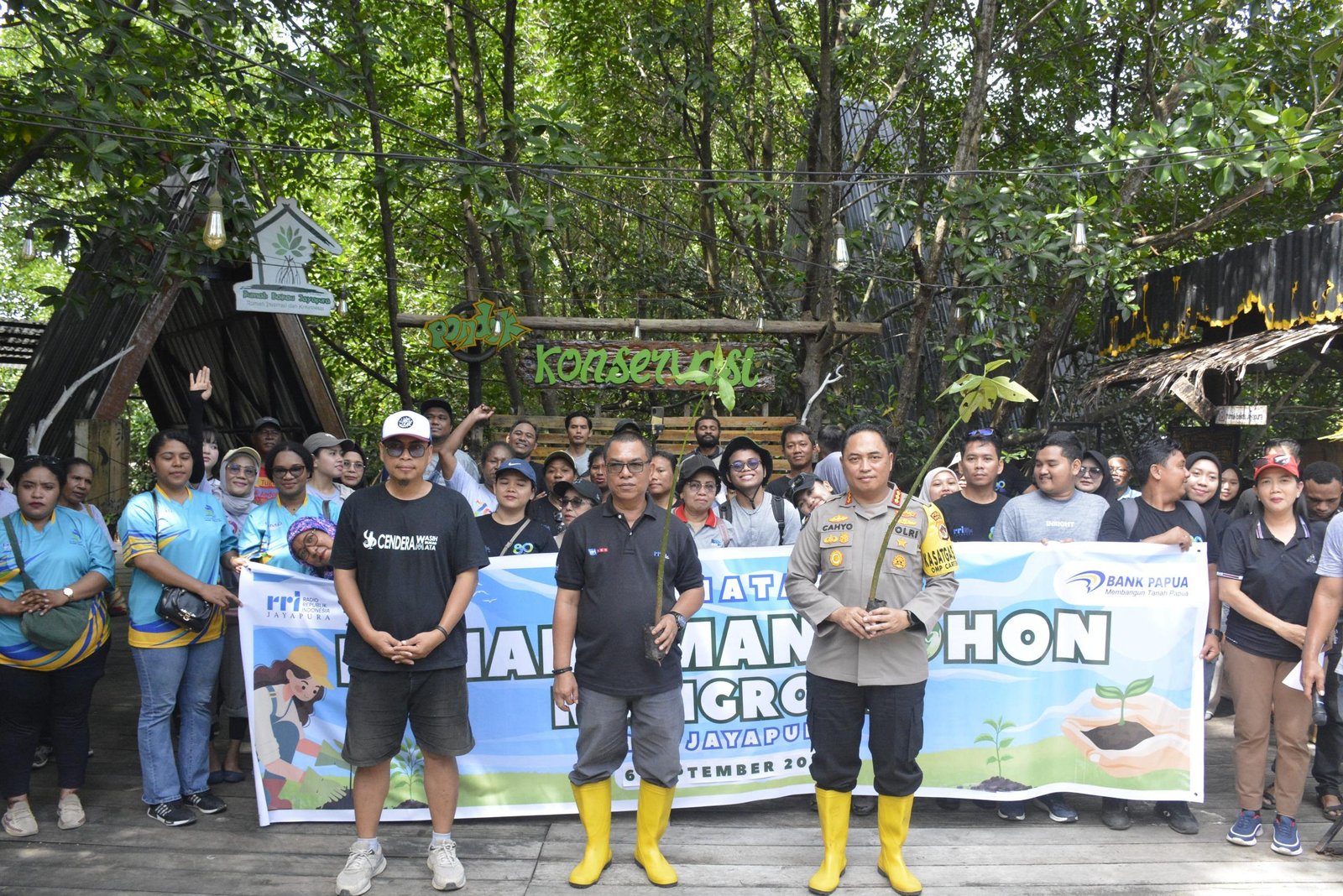 Puncak kegiatan ditandai dengan aksi penanaman pohon mangrove oleh Kabid Humas Polda Papua bersama Kepala Stasiun RRI Jayapura.