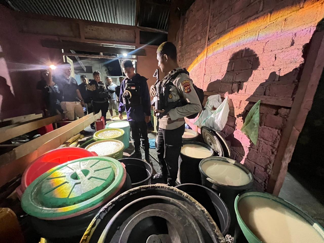 Namun, saat penggerebekan, terduga pelaku tidak berada di tempat. Bahan baku sebanyak 19 ember rendaman langsung dimusnahkan di tempat, dan sekitar 2 ember rempah-rempah seperti kayu manis, cengkeh, dan lain-lain. Untuk penyulingan, menggunakan bambu dan plastik bening.