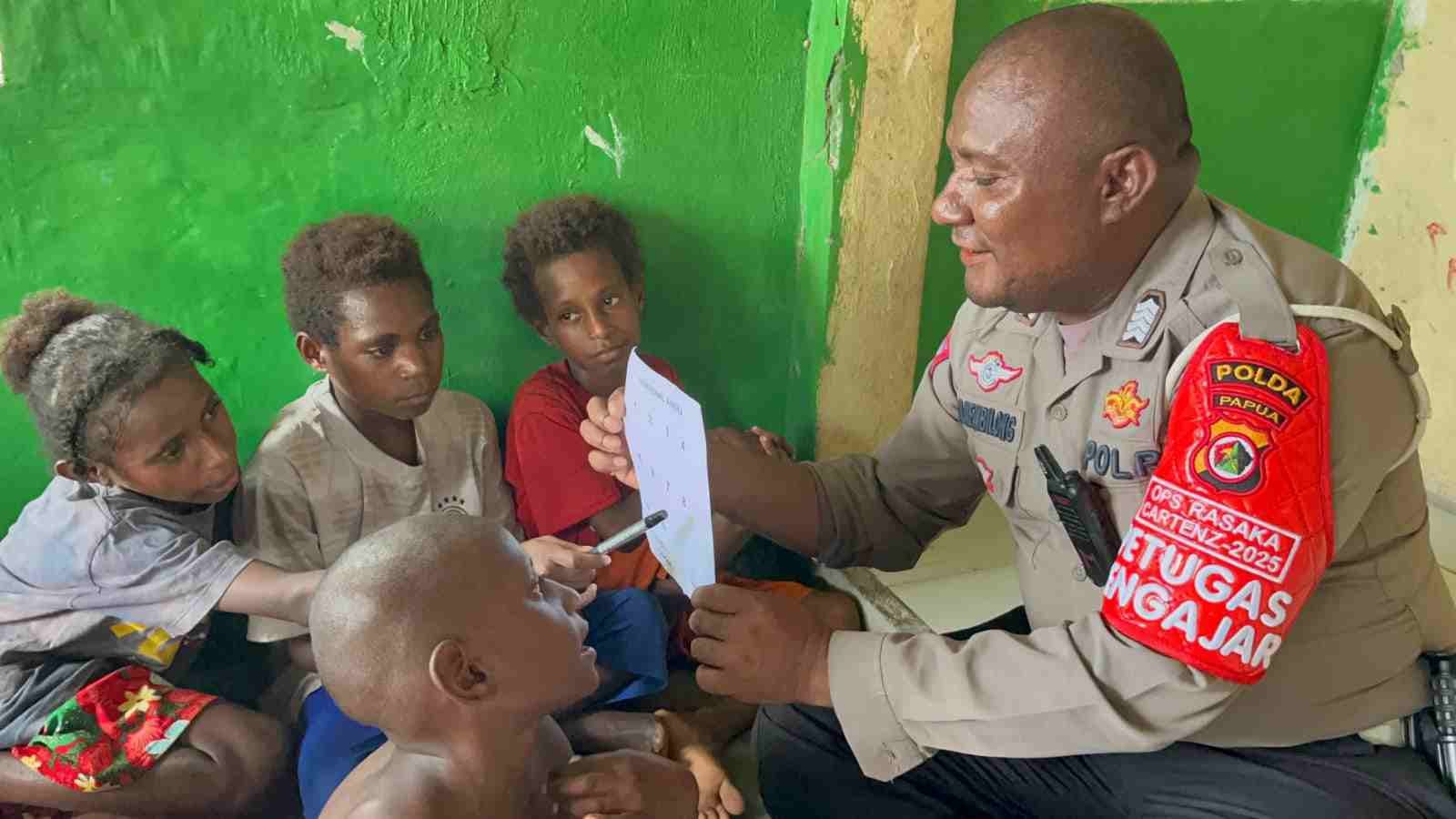 personel secara terjadwal memberikan pelajaran kepada anak-anak di Jalan Sosial Distrik Dekai Kabupaten Yahukimo, Selasa (13/5/25).