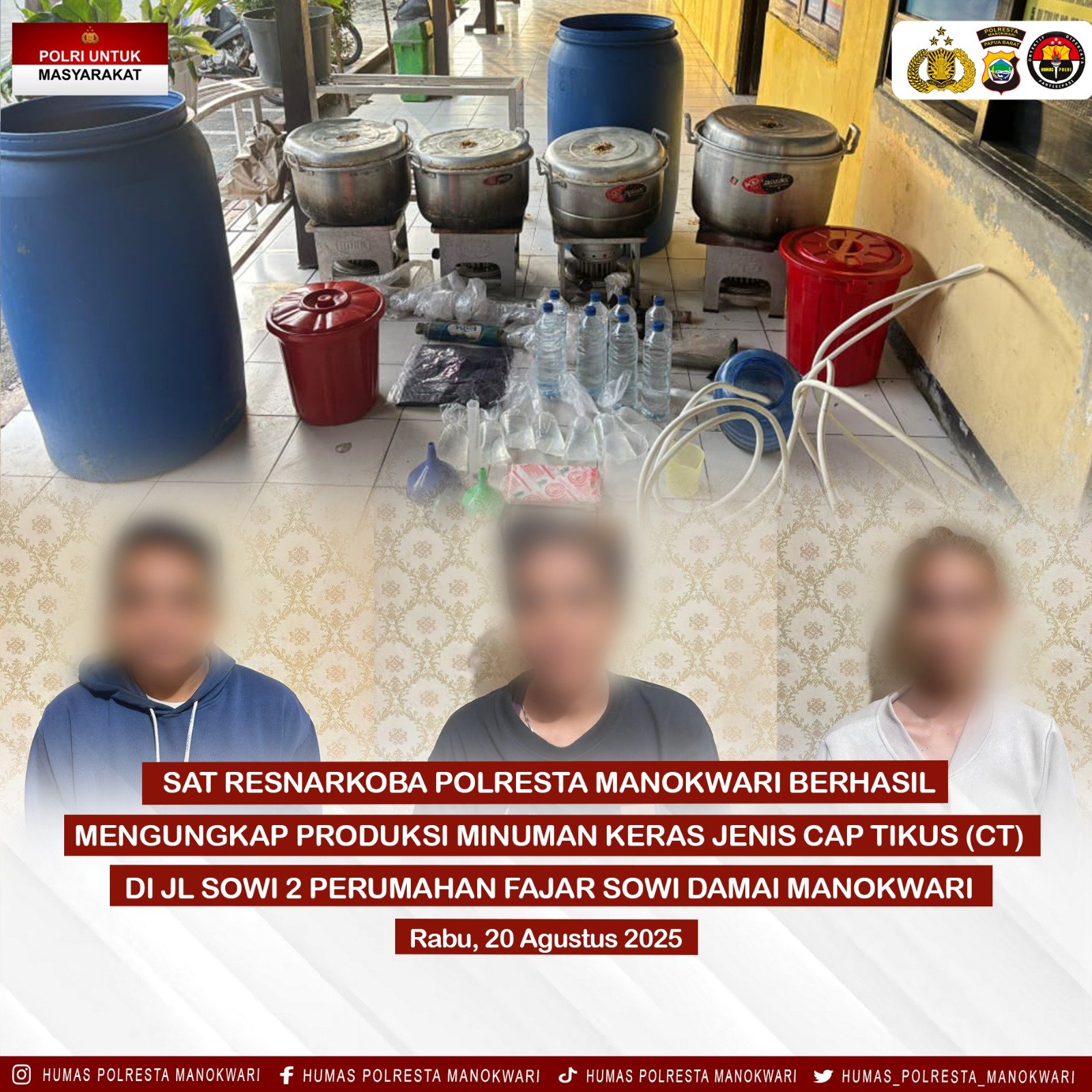Papua Barat – Penggerebekan dilakukan setelah mendapat informasi dari masyarakat bahwa ada produksi minuman keras jenis cap tikus di daerah Jalan Sowi dua perumahan fajar sowi damai Distrik Manokwari Selatan Kabupaten Manokwari, selanjutnya personil Sat Resnarkoba melakukan penyelidikan dan profiling dan mendapatkan informasi tentang pelaku berada di sebuah rumah di Jalan Sowi dua perumahan fajar sowi damai Distrik Manokwari Selatan Kabupaten Manokwari, yang menjadi tempat produksi miras lokal. dari lokasi ini, petugas mengamankan tiga (3) tersangka berinisial L.S.L, 22 tahun, L.O.P, 25 tahun, N.M, 29 tahun beserta barang bukti, 19 Agustus 2025.