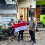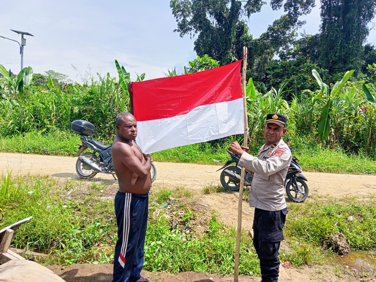 Papua – Dalam rangka menyambut Hari Ulang Tahun (HUT) Kemerdekaan Republik Indonesia ke-80, Kanit Binmas Polsek Muara Tami, IPDA Yanto Rumbruren, bersama jajaran melaksanakan kegiatan pembagian Bendera Merah Putih kepada warga masyarakat di Kampung Mosso, Distrik Muara Tami, Kota Jayapura, Selasa (12/08/2025) pagi.