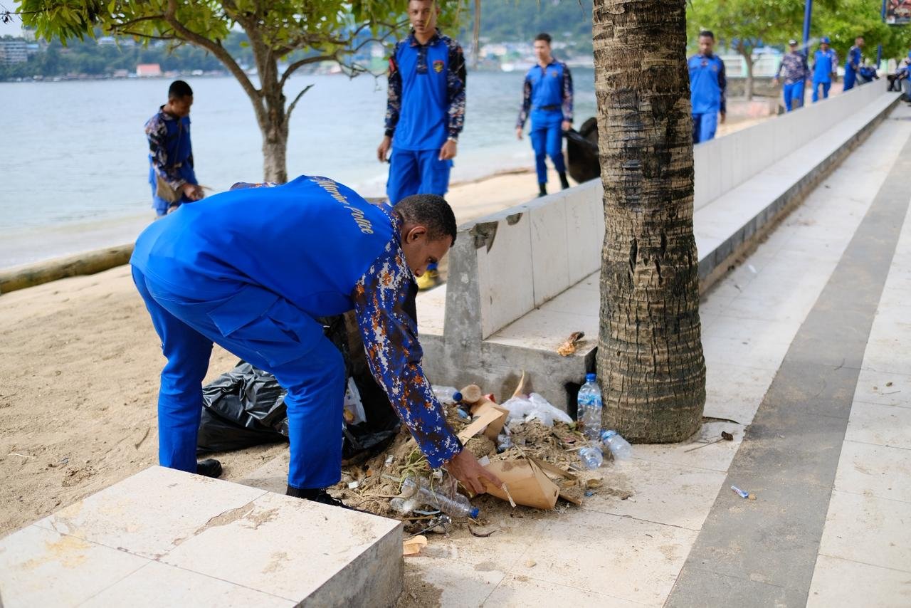 Sejak pagi hari, personel Ditpolairud Polda Papua menyisir sepanjang garis pantai sambil mengumpulkan berbagai jenis sampah seperti plastik, botol, kayu, serta limbah lainnya yang terbawa arus laut maupun yang ditinggalkan pengunjung.